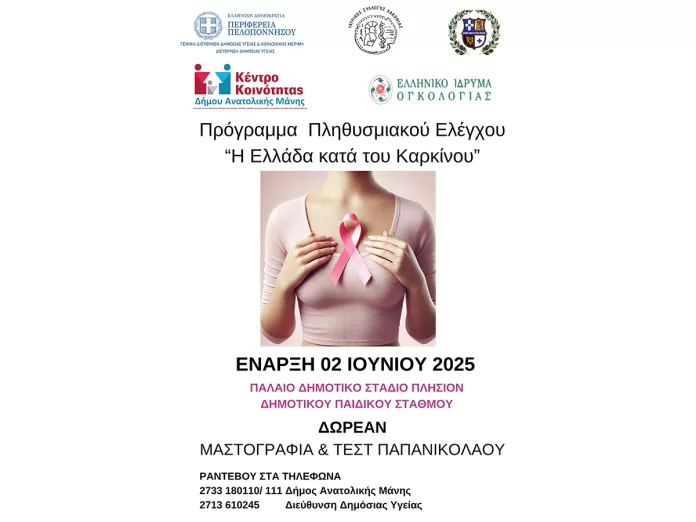 Στο πλαίσιο του προγράμματος πληθυσμιακού ελέγχου «Η ΕΛΛΑΔΑ ΚΑΤΑ ΤΟΥ ΚΑΡΚΙΝΟΥ», που πραγματοποιεί το Ελληνικό Ίδρυμα Ογκολογίας σε συνεργασία με την Περιφέρεια Πελοποννήσου για την πρόληψη και την έγκαιρη διάγνωση του καρκίνου του μαστού και του τραχήλου της μήτρας, ξεκινά την Δευτέρα  02/06/2025 πρόγραμμα πληθυσμιακού ελέγχου για τις γυναίκες που κατοικούν στον Δήμο Ανατολικής Μάνης  με εξέταση Μαστογραφίας και Τεστ Παπανικολάου. Το πρόγραμμα υλοποιείται υπό την αιγίδα της Περιφέρειας ΠελοποννήσουΓενική Διεύθυνση Δημόσιας Υγείας & Κοινωνικής Μέριμνας, του Δήμου Ανατολικής Μάνης και του Ιατρικού Συλλόγου Λακωνίας.