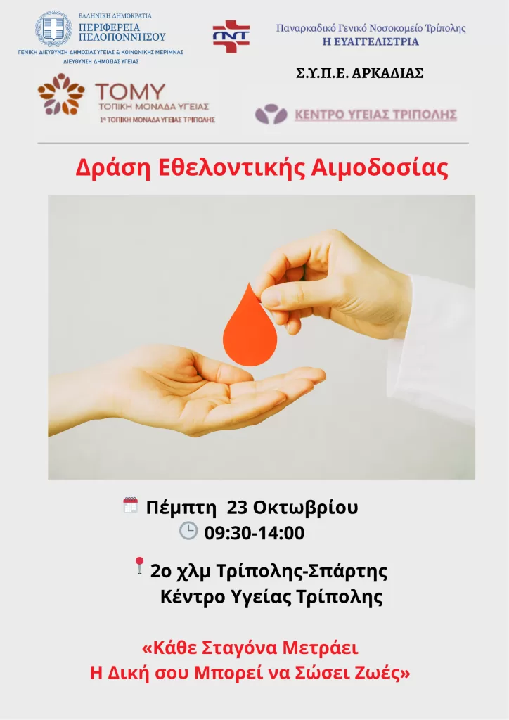Η Γενική Διεύθυνση Δημόσιας Υγείας και Κοινωνικής Μέριμνας σε συνεργασία με το τμήμα αιμοδοσίας του Γενικού Παναρκαδικού Νοσοκομείου Τρίπολης, το Κέντρο Υγείας Τρίπολης και τον Σύλλογο Υπαλλήλων Π.Ε. Αρκαδίας, πραγματοποιούν σήμερα Πέμπτη 23 Οκτωβρίου και ώρα 09:30 – 14:00, ανοιχτή εθελοντική αιμοδοσία στις εγκαταστάσεις του Κέντρου Υγείας Τρίπολης (2ο χλμ Τρίπολης-Σπάρτης), στην Τρίπολη.
