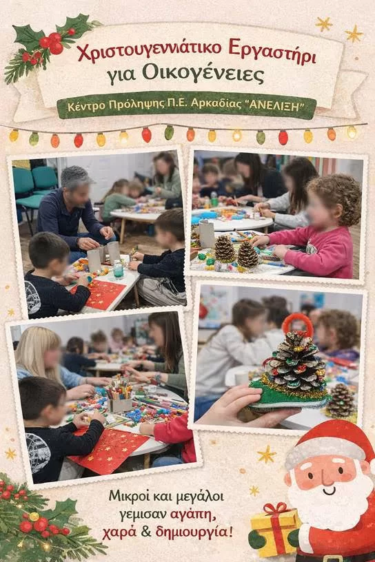 Με μεγάλη συμμετοχή και ιδιαίτερα θετικό κλίμα πραγματοποιήθηκε το Χριστουγεννιάτικο Εργαστήρι για Γονείς και Παιδιά, που διοργάνωσε το Κέντρο Πρόληψης Π.Ε. Αρκαδίας «ΑΝΕΛΙΞΗ», τη Δευτέρα 16 Δεκεμβρίου 2025.