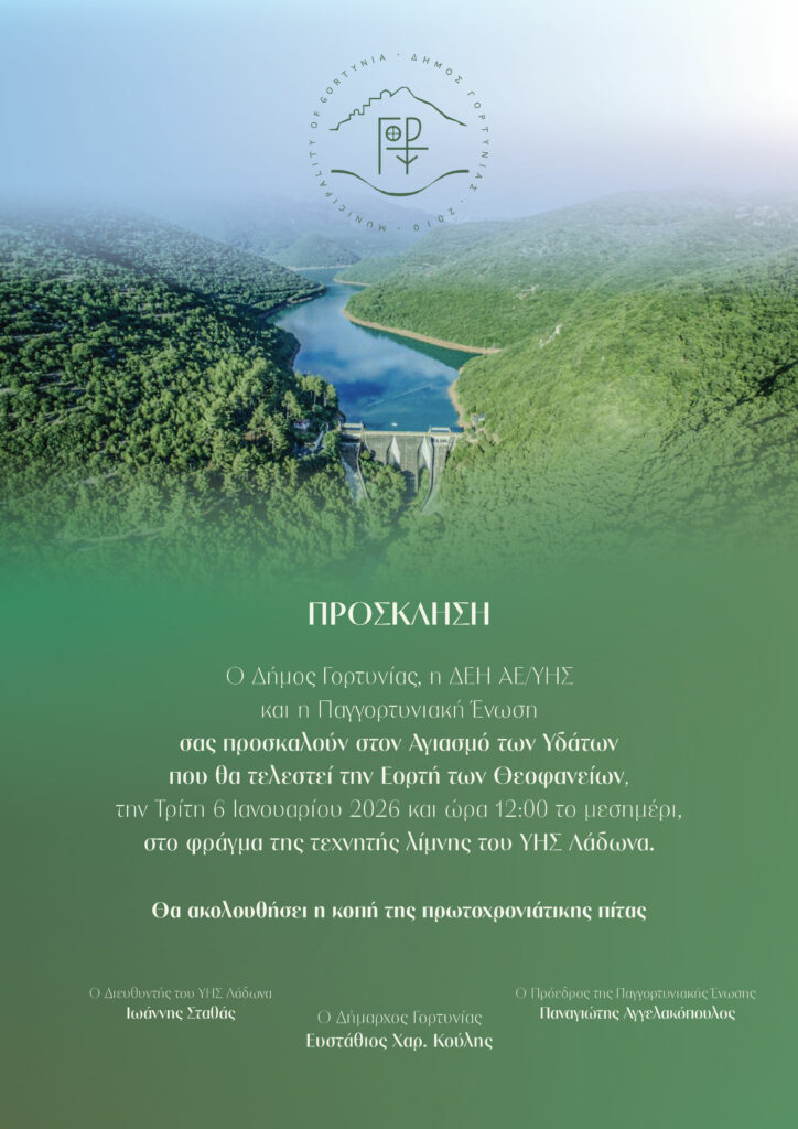 Ο Δήμος Γορτυνίας, η ΔΕΗ ΑΕ/ΥΗΣ και η Παγγορτυνιακή Ένωση σας προσκαλούν στον Αγιασμό των Υδάτων που θα τελεστεί την Εορτή των Θεοφανείων, την Τρίτη 6 Ιανουαρίου και ώρα 12:00 το μεσημέρι,