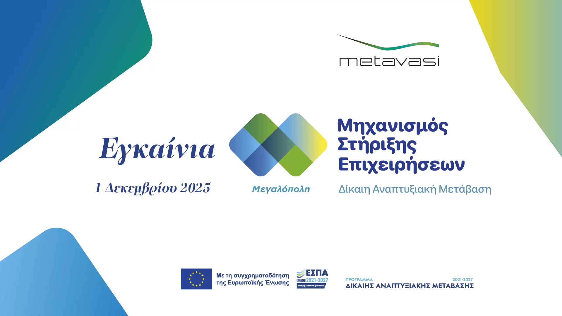 Η Ελληνική Εταιρεία Δίκαιης Αναπτυξιακής Μετάβασης (ΜΕΤΑΒΑΣΗ ΜΑΕ) σας προσκαλεί στα εγκαίνια της Περιφερειακής Δομής Μεγαλόπολης το Μηχανισμού Στήριξης Επιχειρήσεων, η οποία εντάσσεται στο πλαίσιο του Έργου «Μηχανισμός Στήριξης Επιχειρηματικότητας για τη Δίκαιη Αναπτυξιακή Μετάβαση» και χρηματοδοτείται από το Επιχειρησιακό Πρόγραμμα Δίκαιης Αναπτυξιακής Μετάβασης ΕΣΠΑ 2021-2027.