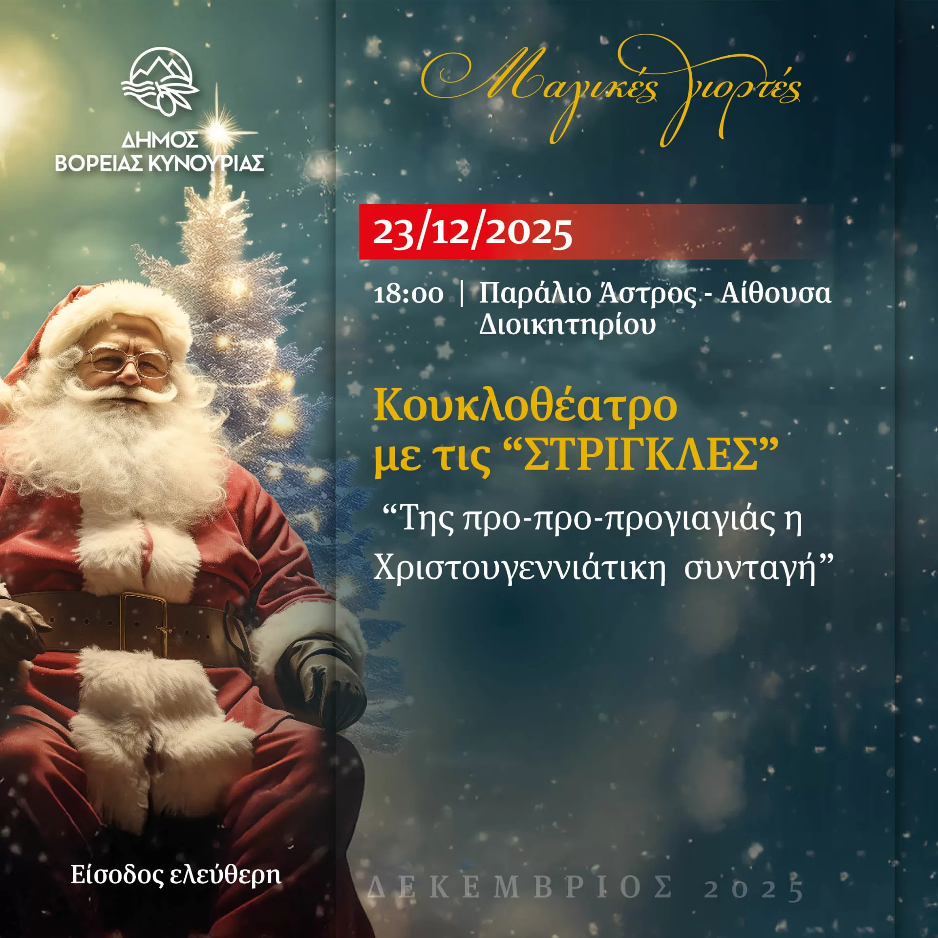 Την Τρίτη 23 Δεκεμβρίου και ώρα 18:00 στο Παράλιο Άστρος, στην αίθουσα Διοικητηρίου ελάτε να ταξιδέψουμε μαζί στον κόσμο των παραμυθιών με τη μαγική Χριστουγεννιάτικη παράσταση ”Της προ-προ-προγιαγιάς η Χριστουγεννιάτικη Συνταγή”.