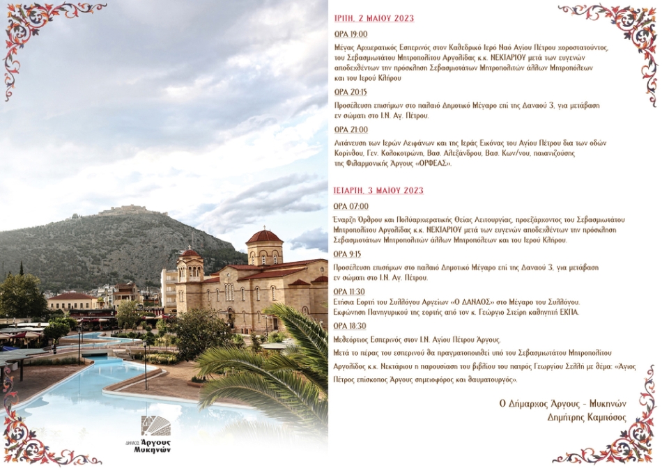 Ο Δήμαρχος Άργους Μυκηνών Δημήτριος Καμπόσος και τα μέλη του Δημοτικού Συμβουλίου έχουν την ευχαρίστηση να σας προσκαλέσουν στις εκδηλώσεις εορτασμού του Πολιούχου Άργους Αγίου Πέτρου, την 2 & 3 Μάϊου. Ακολουθεί το πρόγραμμα: