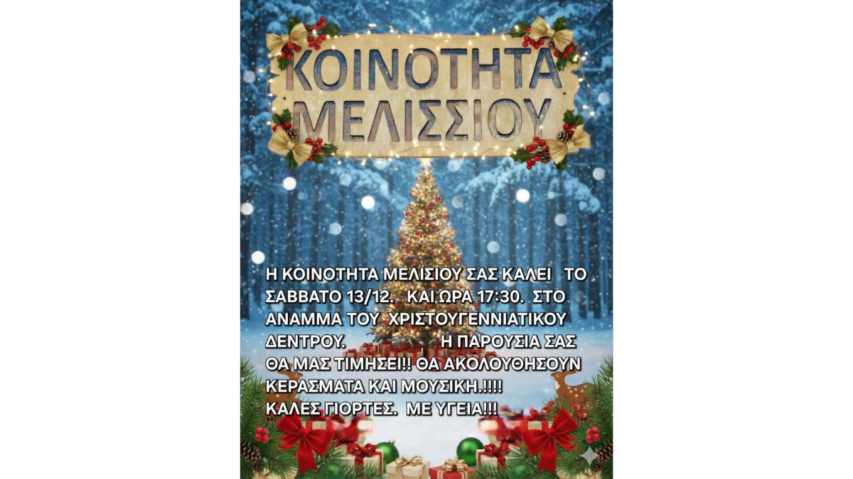 Η Κοινότητα Μελισσίου σας προσκαλεί στη Φωταγώγηση του Χριστουγεννιάτικου Δέντρου, μια ζεστή γιορτινή συνάντηση που σηματοδοτεί την επίσημη έναρξη της χριστουγεννιάτικης περιόδου στο χωριό μας.