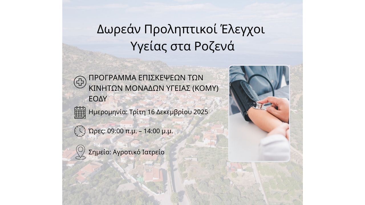 Ο Δήμος Ξυλοκάστρου -Ευρωστίνης, σε συνεργασία με το Υπουργείο Υγείας, τις Κινητές Ομάδες Υγείας (ΚΟΜΥ) του Εθνικού Οργανισμού Δημόσιας Υγείας (ΕΟΔΥ) και τις Υγειονομικές Περιφέρειες (ΥΠΕ) ανακοινώνει την έναρξη προγράμματος επισκέψεων προληπτικού ελέγχου και ενημέρωσης σε οικισμούς του Δήμου, με στόχο την ενίσχυση της πρωτοβάθμιας φροντίδας και την ισότιμη πρόσβαση όλων των δημοτών σε βασικές υπηρεσίες υγείας.