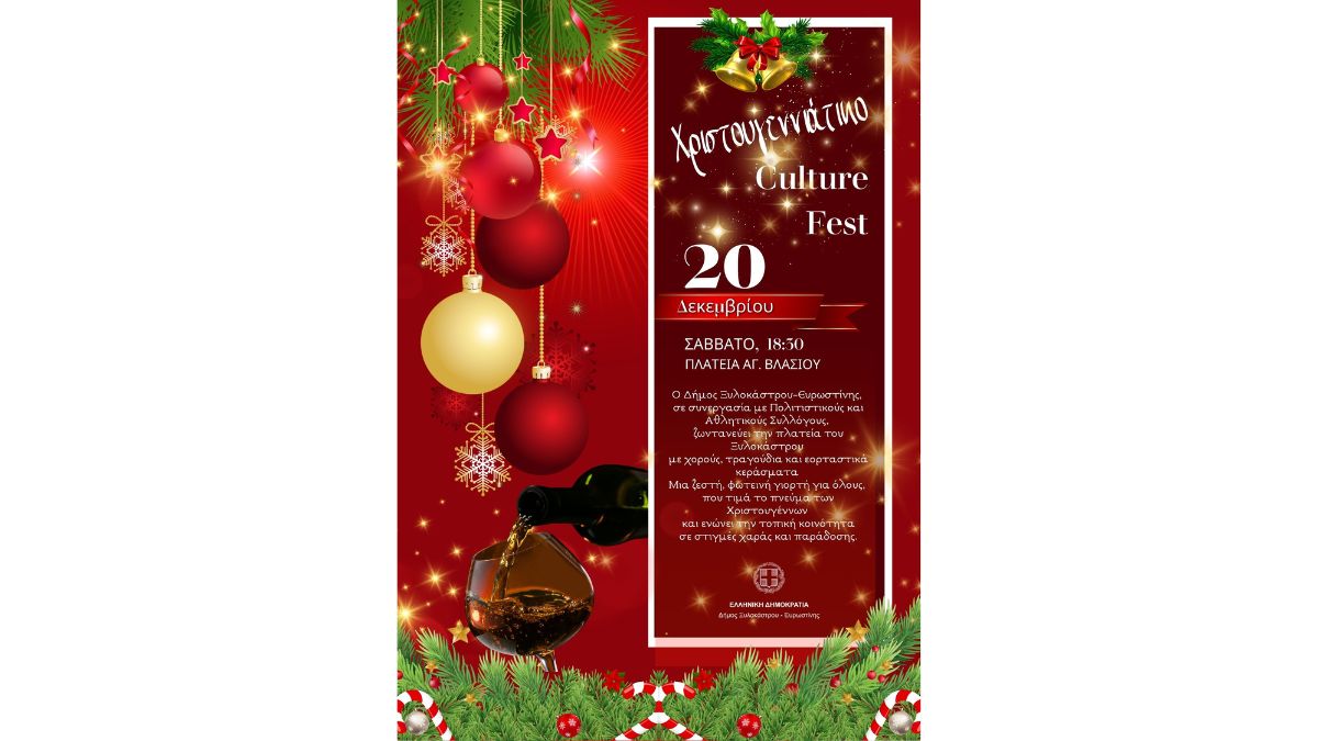 Ο Δήμος Ξυλοκάστρου – Ευρωστίνης, σε συνεργασία με τους πολιτιστικούς συλλόγους της περιοχής, διοργανώνει το Σάββατο 20 Δεκεμβρίου μια λαμπερή Χριστουγεννιάτικη εκδήλωση στην κεντρική πλατεία της πόλης.