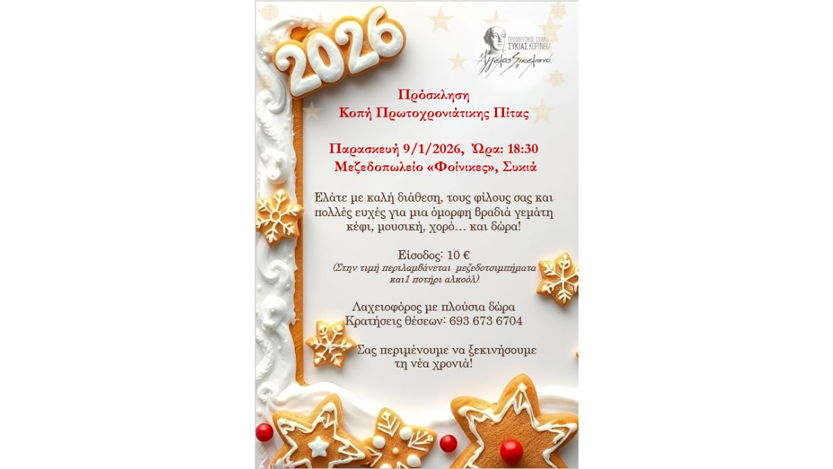 Την Παρασκευή 9 Ιανουαρίου 2026, στις 18:30, πραγματοποιείται η Κοπή της Πρωτοχρονιάτικης Πίτας 2026 του Προοδευτικού Συλλόγου Συκιάς Κορινθίας «Άγγελος Σικελιανός» στο μεζεδοπωλείο «Φοίνικες» στη Συκιά.