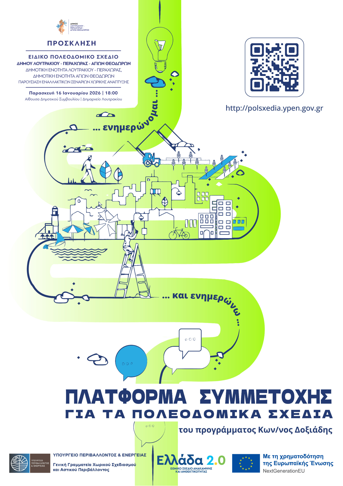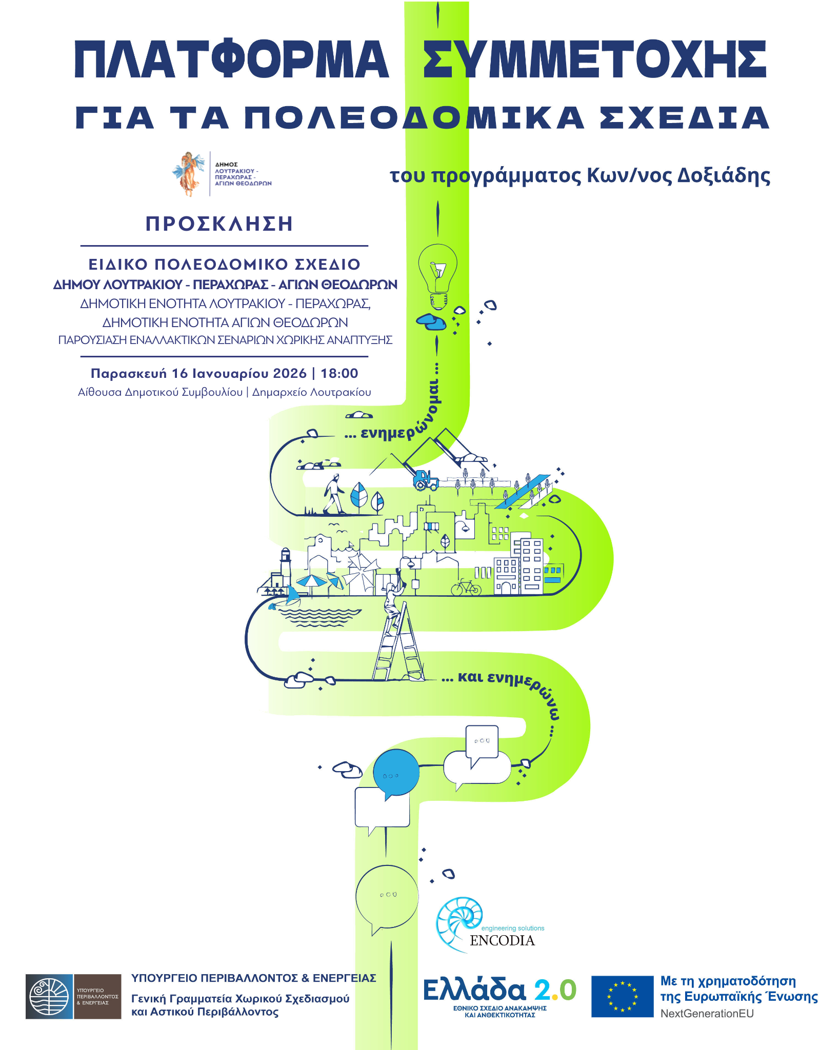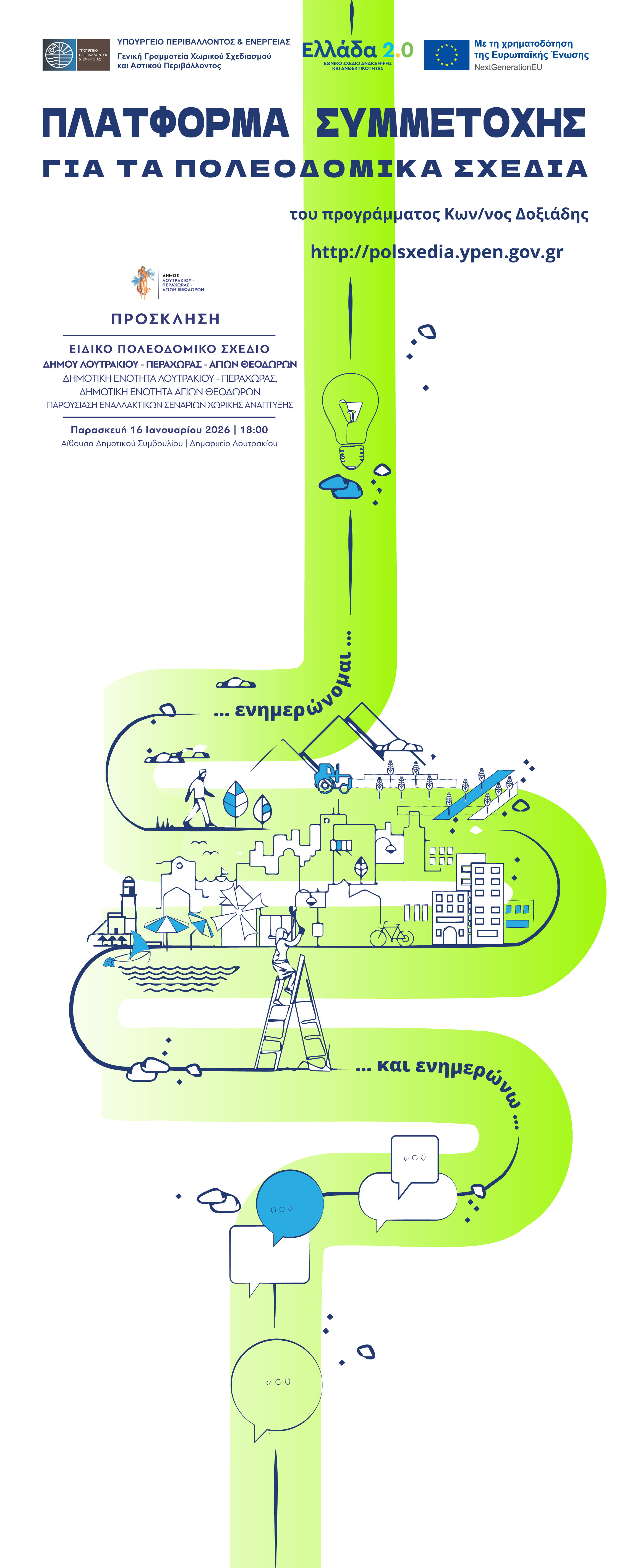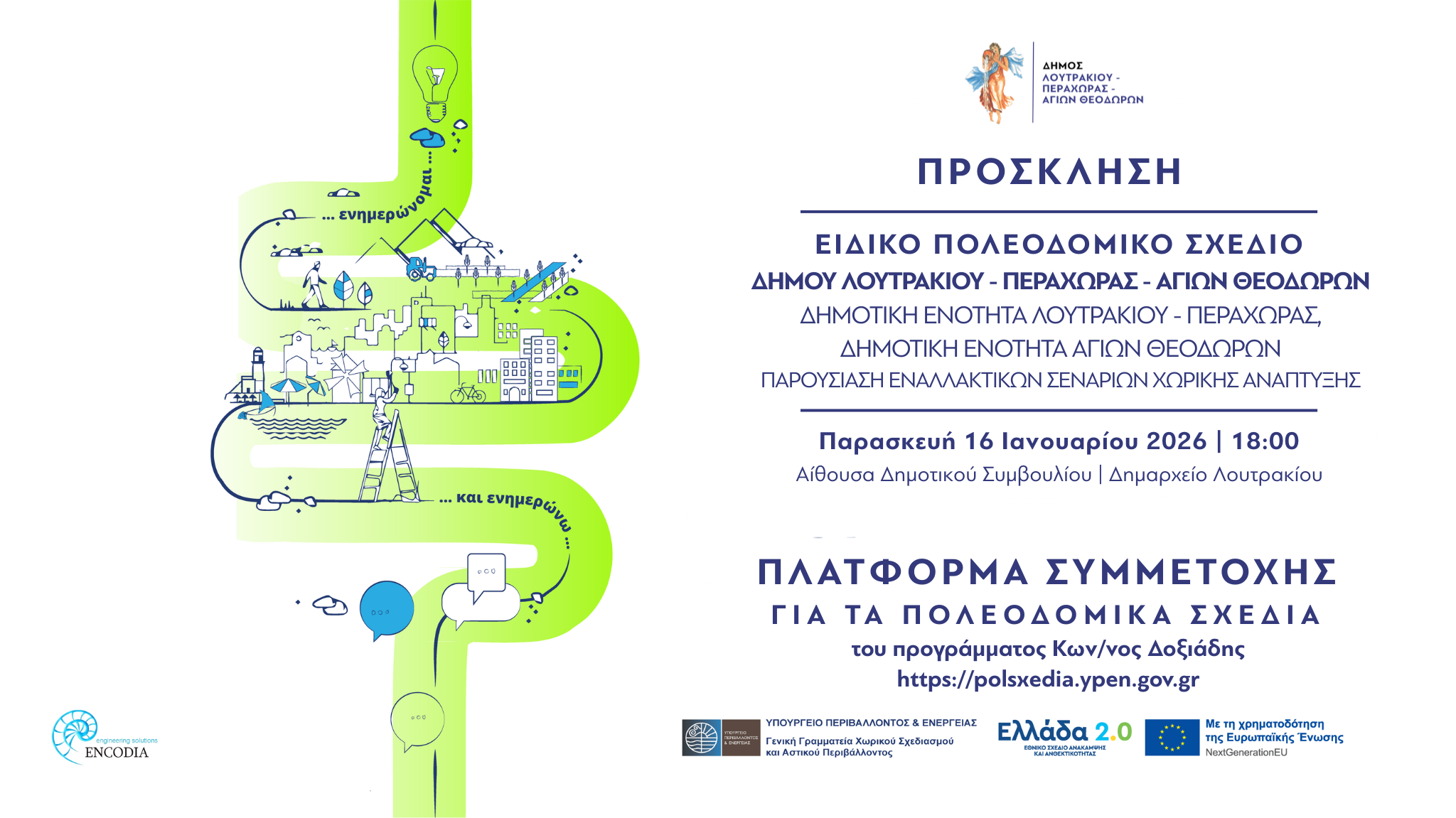 Ο Δήμος Λουτρακίου – Περαχώρας – Αγίων Θεοδώρων σας προσκαλεί στην εκδήλωση παρουσίασης των Εναλλακτικών Σεναρίων Χωρικής Ανάπτυξης για το Ειδικό Πολεοδομικό Σχέδιο (Ε.Π.Σ.) των Δημοτικών Ενοτήτων: