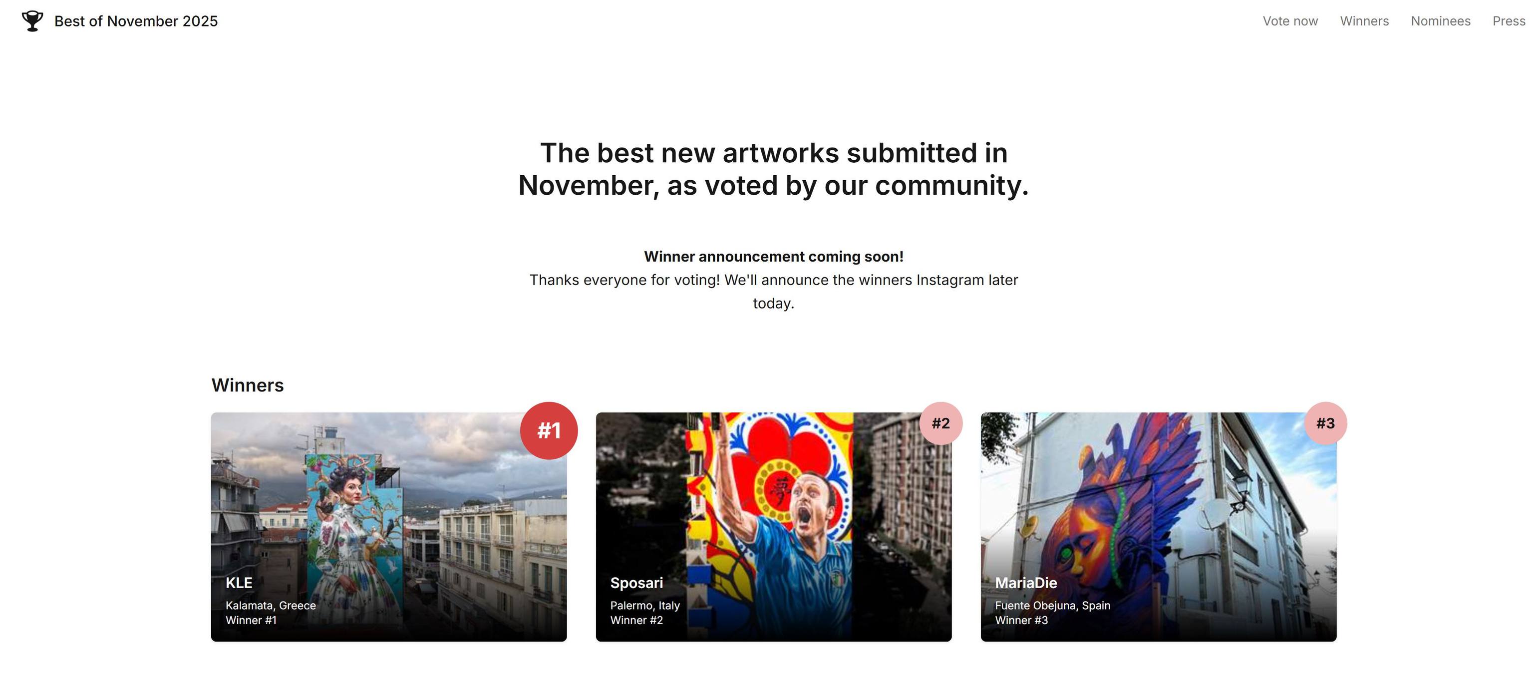 «Απερίγραπτη χαρά και τιμή! Θέλω να πω ένα τεράστιο ευχαριστώ σε όλες και όλους εσάς που στηρίξατε, ψηφίσατε, μοιραστήκατε και αγκαλιάσατε αυτό το έργο από την πρώτη στιγμή. Η συμμετοχή σας, τα μηνύματά σας και η αγάπη που έλαβα δεν περιγράφονται. Αυτό το αποτέλεσμα ανήκει σε όλους μας!», σημειώνει σε ανάρτησή του ο διεθνώς αναγνωρισμένος καλλιτέχνης Κλεομένης Κωστόπουλος, γνωστός και ως KLE.