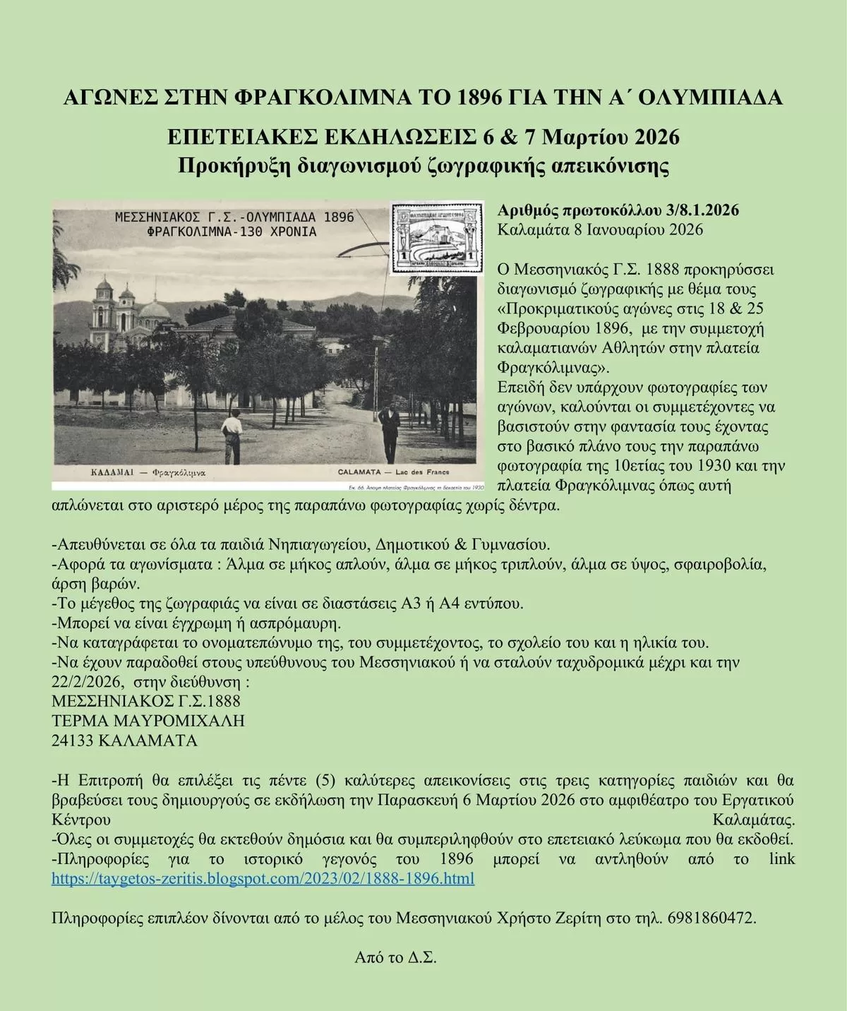 Ο Μεσσηνιακός Γ.Σ. 1888 προκηρύσσει διαγωνισμό ζωγραφικής με θέμα τους «Προκριματικούς αγώνες στις 18 & 25 Φεβρουαρίου 1896, με την συμμετοχή καλαματιανών Αθλητών στην πλατεία Φραγκόλιμνας».