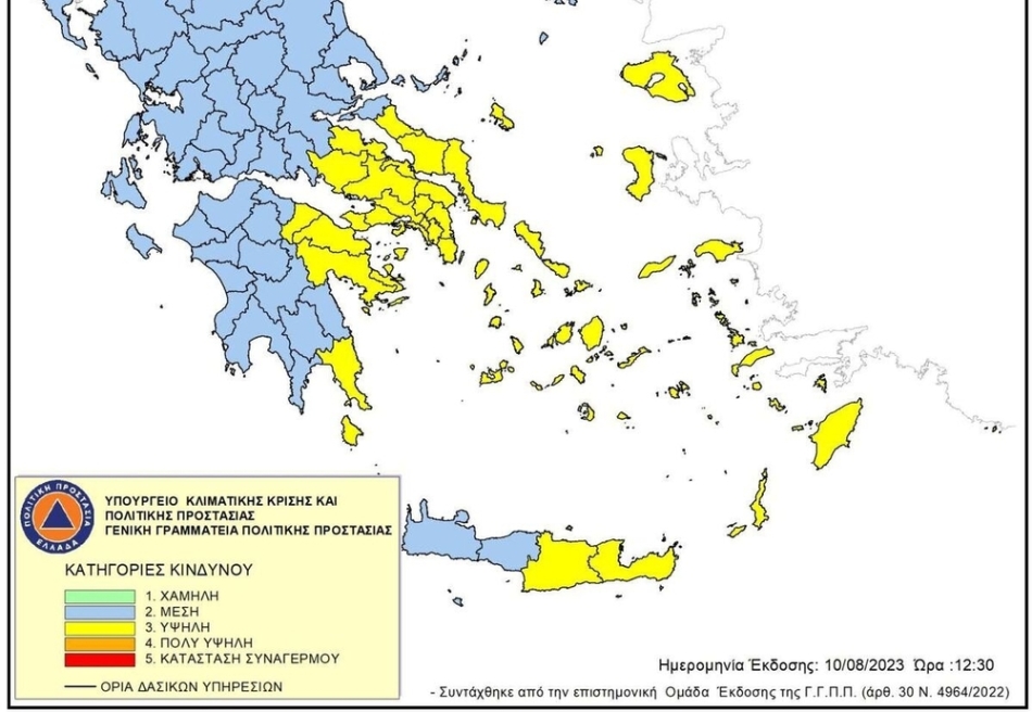 Υψηλός κίνδυνος εκδήλωσης πυρκαγιάς υπάρχει σήμερα, Παρασκευή (11/8) για τις παρακάτω περιοχές, σύμφωνα με το υπουργείο Κλιματικής Κρίσης και Πολιτικής Προστασίας.